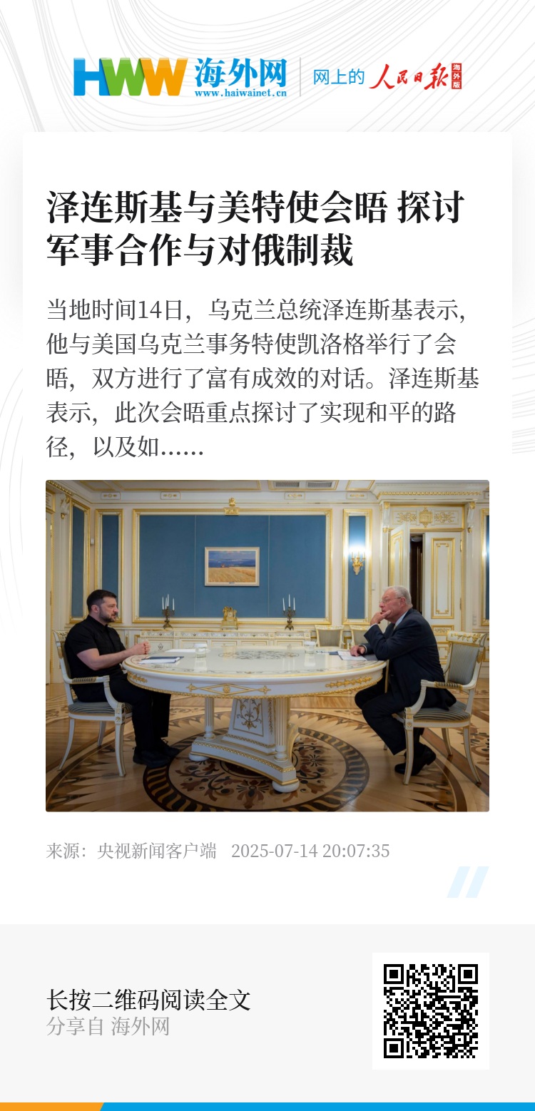当地时间14日,乌克兰总统泽连斯基表示,他与美国乌克兰事务特使凯洛格举行了会晤,双方进行了富有成效的对话。