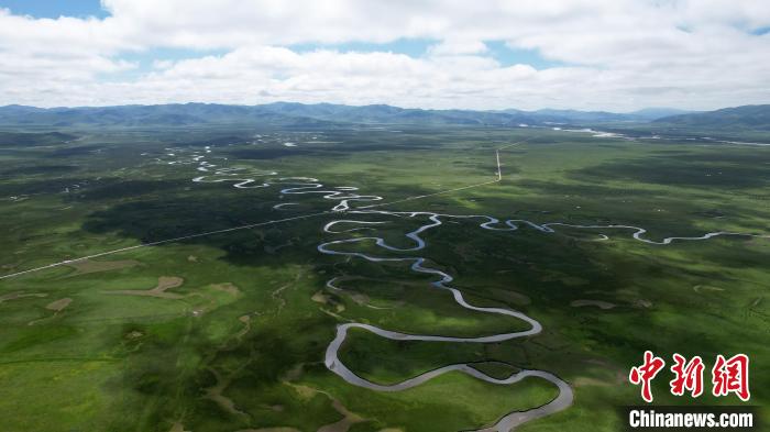 7月12日,采访团走进甘南州玛曲县阿万仓湿地,空中俯瞰绿意盎然的支流在湿地中百转千回,十分壮美。九美旦增 摄