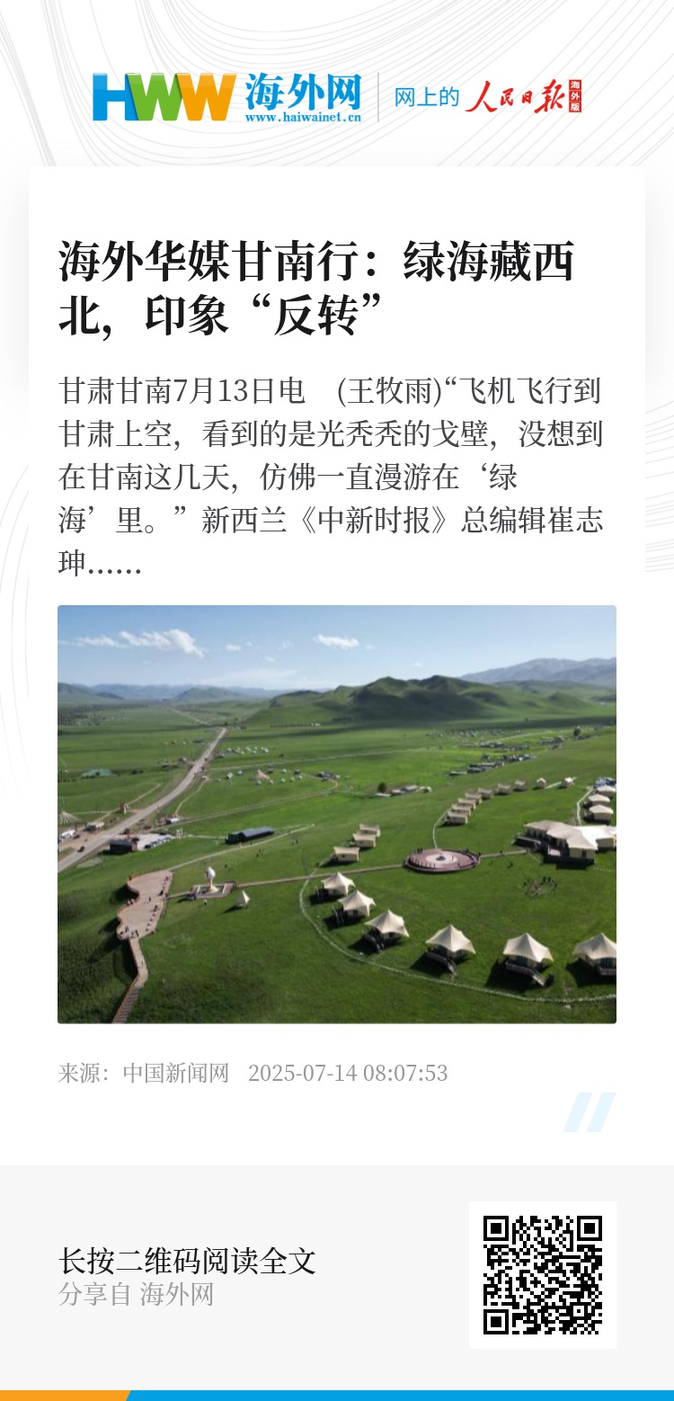 盛夏的甘南州绿意铺展至天际。7日至15日,2025海外华文媒体甘南行活动在此举行。来自法国、加拿大、日本、巴西、澳大利亚等12个国家和地区的18家海外华文媒体代表,深入甘南腹地,海拔从2800米抬升到4000米,一路绿浪从黄河首曲铺展到石城藏寨。外媒代表们用镜头和笔触记录下一个真实、立体、鲜活的“生态甘南”。