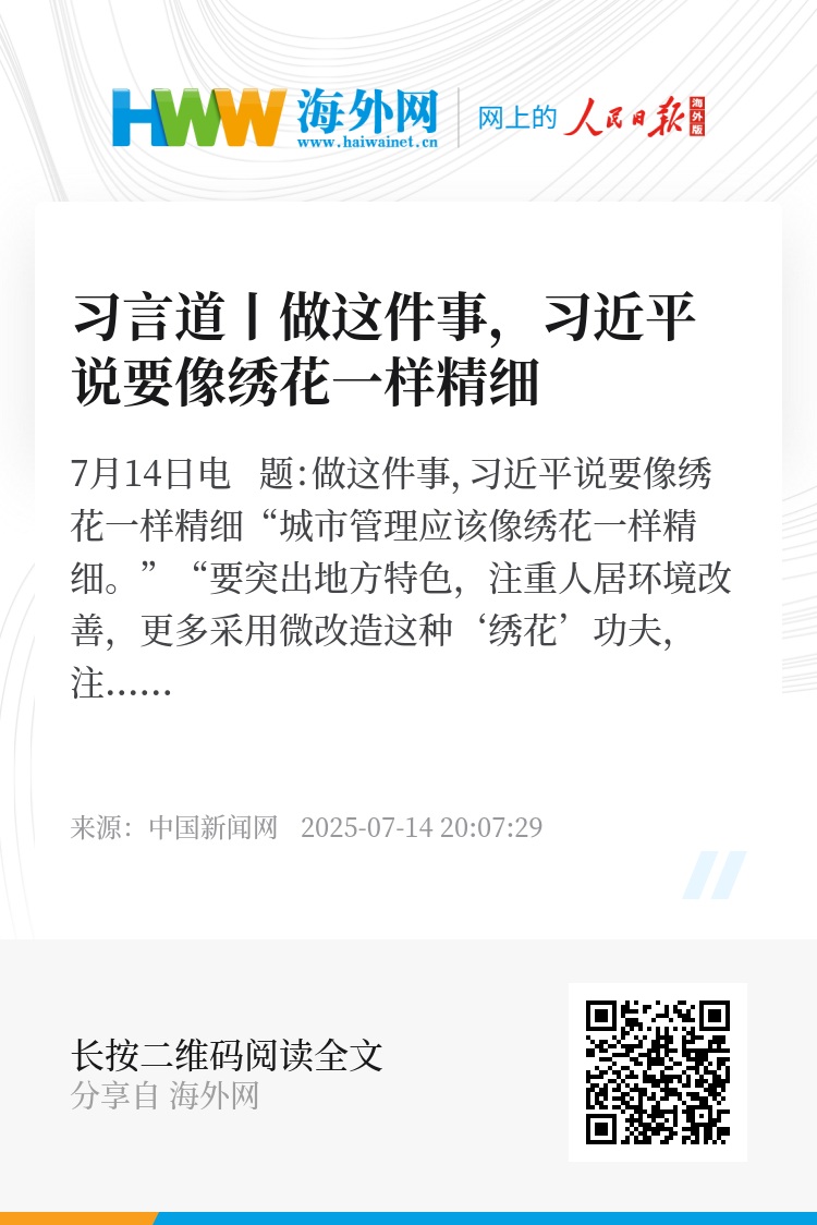 中新网7月14日电 题:做这件事,习近平说要像绣花一样精细