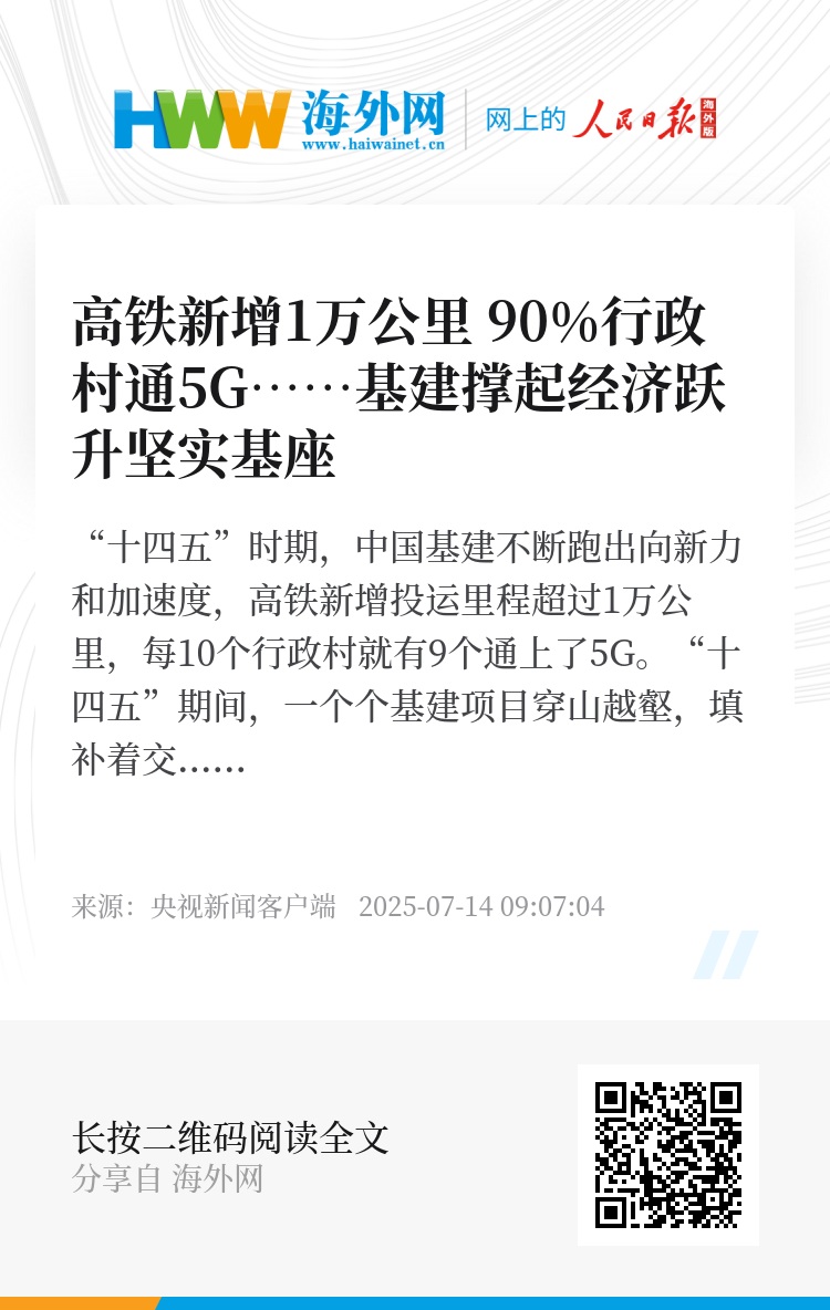 “十四五”时期,中国基建不断跑出向新力和加速度,高铁新增投运里程超过1万公里,每10个行政村就有9个通上了5G。