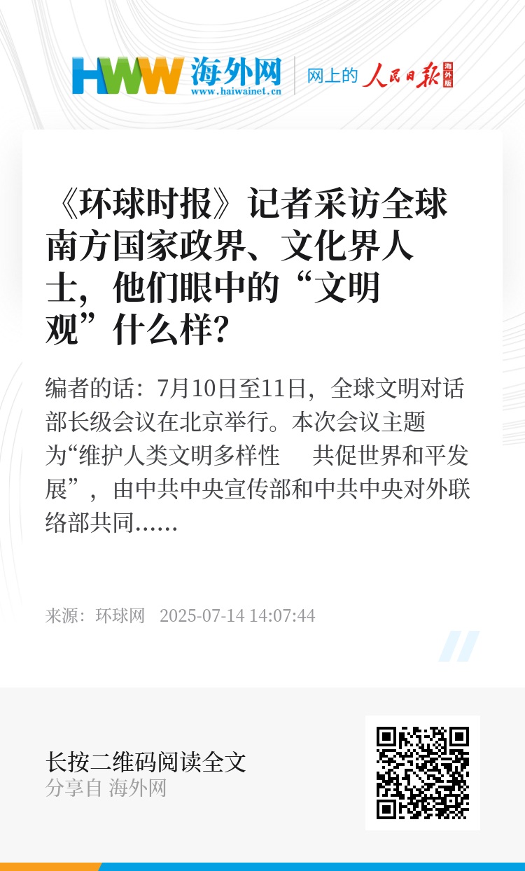 编者的话:7月10日至11日,全球文明对话部长级会议在北京举行。本次会议主题为“维护人类文明多样性 共促世界和平发展”,由中共中央宣传部和中共中央对外联络部共同主办,来自约140个国家和地区的政界、文化界、教育界人士等600余人出席开幕式。在11日举办的“文明交流互鉴与文化传承创新”平行分论坛上,发布了《“我们的文明观”全球民意调查》成果,探究海外受访者对文明交流互鉴理念的认知态度、对中华文明的整体评价及跨文化交流的实践状况。会议期间,《环球时报》记者采访了来自埃及、印尼、巴基斯坦、南非、吉尔吉斯斯坦、津巴布韦等全球南方国家的政界、文化界人士,听他们讲述心中的“文明观”,以及对中国与全球南方国家文明互鉴之路的探索和思考。