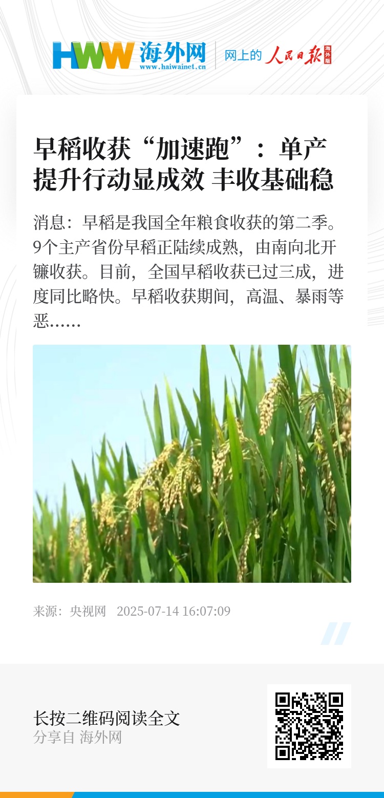 今年,国家继续提高早籼稻最低收购价,稳定农民种粮预期。据农业农村部最新农情调度,全国早稻播种面积保持稳定,目前,早稻收获进展顺利。