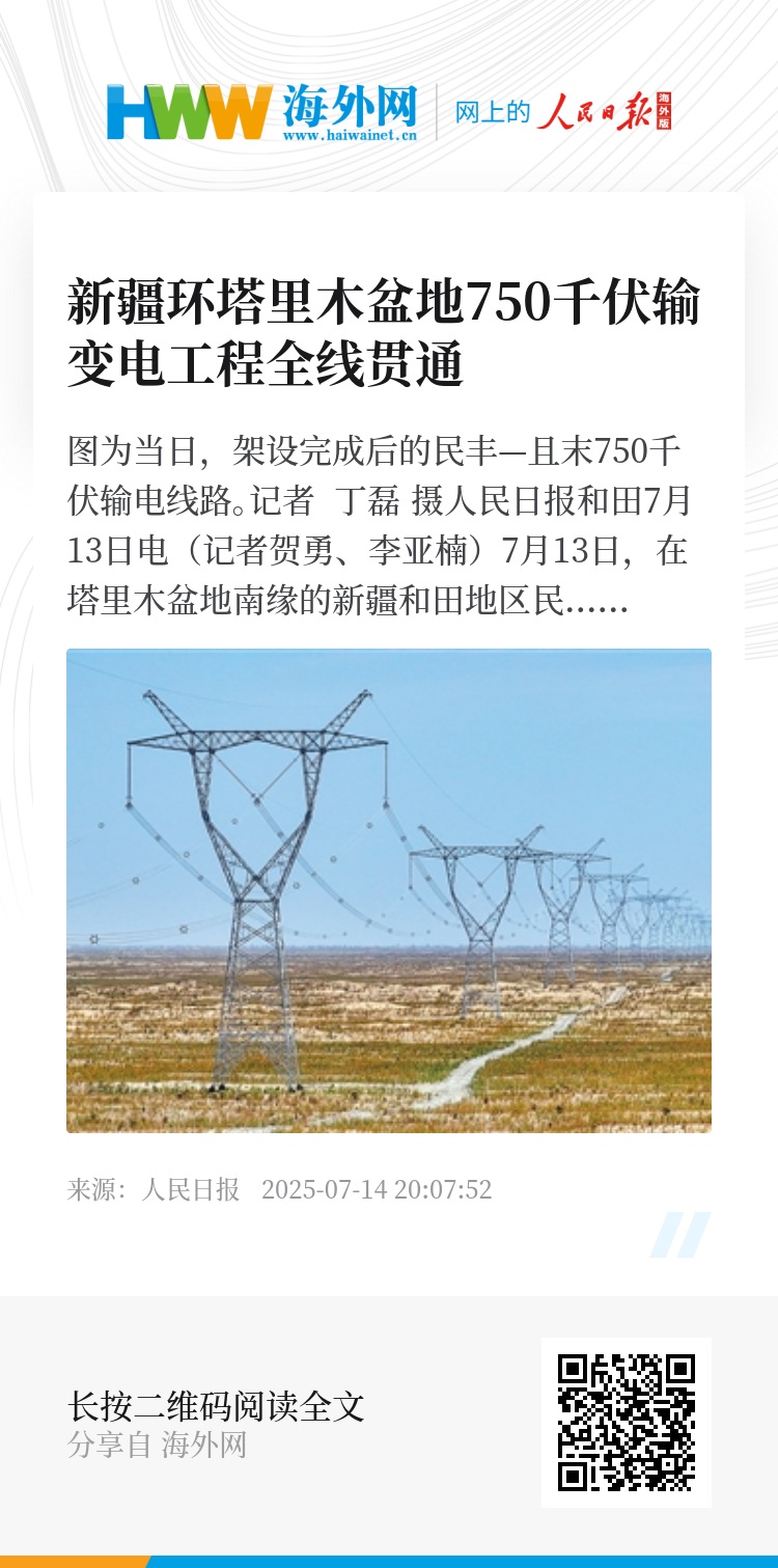 人民日报和田7月13日电(记者贺勇、李亚楠)7月13日,在塔里木盆地南缘的新疆和田地区民丰县,历时15年建设的环塔里木盆地750千伏输变电工程全线贯通。该工程由9项750千伏输变电工程分阶段施工完成,线路总长4197公里,预计整个工程于今年11月投入运行。