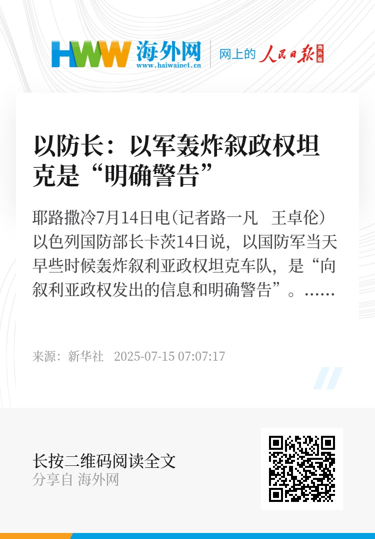 新华社耶路撒冷7月14日电(记者路一凡 王卓伦)以色列国防部长卡茨14日说,以国防军当天早些时候轰炸叙利亚政权坦克车队,是“向叙利亚政权发出的信息和明确警告”。