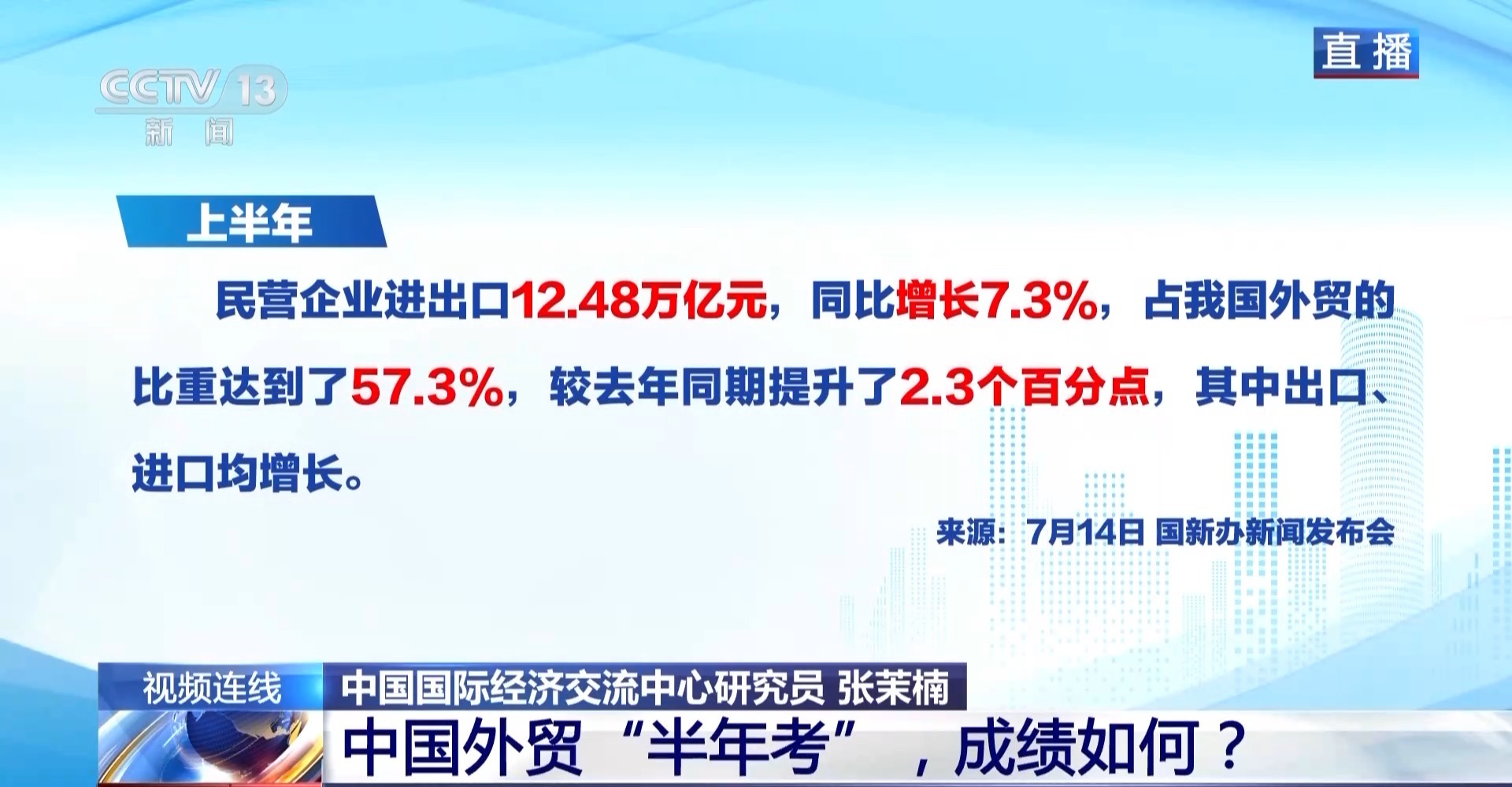中国国际经济交流中心研究员 张茉楠:整体看今年上半年的外贸成绩确实超乎预期,经历外部的不确定性,包括贸易摩擦,以及贸易保护主义所带来的冲击之下所取得的成绩。总体来讲可以用价增质优来形容,尤其是对于整体的贸易结构而言,可以说交出了一份比较满意的答卷。