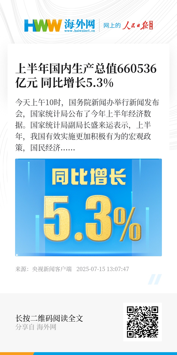 今天上午10时,国务院新闻办举行新闻发布会,国家统计局公布了今年上半年经济数据。国家统计局副局长盛来运表示,上半年,我国有效实施更加积极有为的宏观政策,国民经济顶住压力、迎难而上,经济运行总体平稳、稳中向好。初步核算,上半年国内生产总值660536亿元,按不变价格计算,同比增长5.3%。