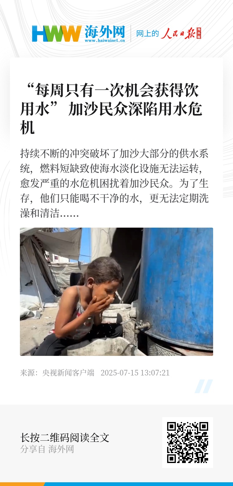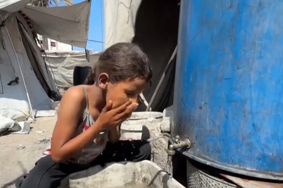 持续不断的冲突破坏了加沙大部分的供水系统,燃料短缺致使海水淡化设施无法运转,愈发严重的水危机困扰着加沙民众。为了生存,他们只能喝不干净的水,更无法定期洗澡和清洁衣物、被褥。炎热的天气、被污染的饮用水和恶劣的卫生条件使很多当地民众都患上了疾病。