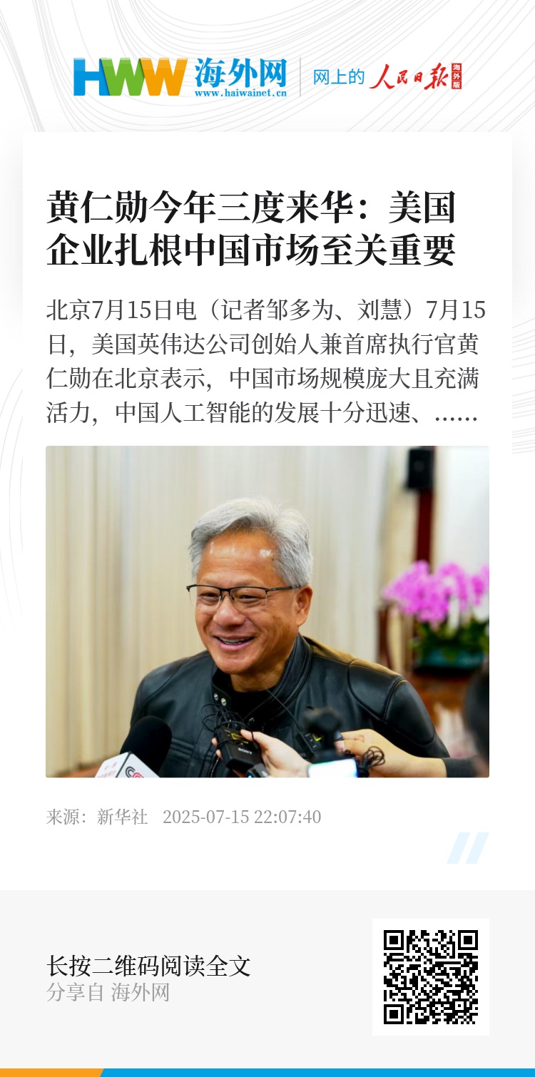 新华社北京7月15日电(记者邹多为、刘慧)7月15日,美国英伟达公司创始人兼首席执行官黄仁勋在北京表示,中国市场规模庞大且充满活力,中国人工智能的发展十分迅速、潜力巨大,美国企业扎根中国市场至关重要。