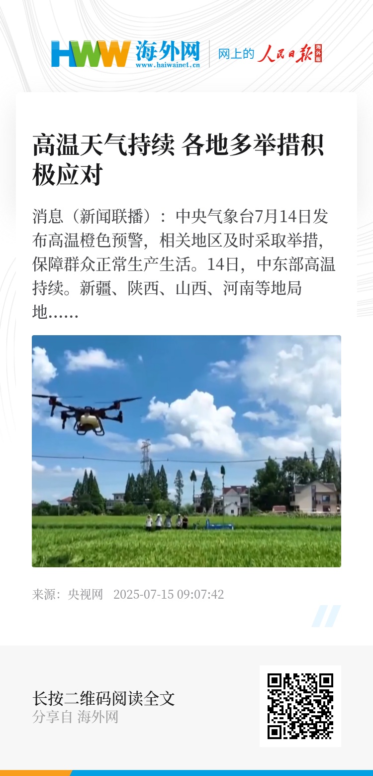 为减少高温对农业生产的影响,各地还及时加强田间服务指导。在咸阳彬州市,当地组织农业技术人员及时查看果树病虫害情况,指导果农科学防治。此时正值南方中稻孕穗、晚稻育秧的关键期。在江西新余,当地动态调整山塘水库的开闸放水计划,保障水稻供水充足。为避免高温干燥导致花粉活力下降、病虫害易发的情况,安徽组织5000多名农技人员,赴生产一线开展技术指导,同时用无人机为秧苗喷洒营养液。中央气象台预计,15日、16日是高温影响范围最广、强度最强的时段,部分地区最高气温可达39—42℃,公众需持续做好防暑降温。