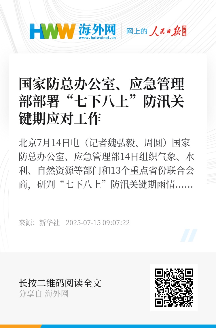 新华社北京7月14日电(记者魏弘毅、周圆)国家防总办公室、应急管理部14日组织气象、水利、自然资源等部门和13个重点省份联合会商,研判“七下八上”防汛关键期雨情汛情和台风形势,分析洪涝台风灾害风险,研究部署防汛救灾重点工作。