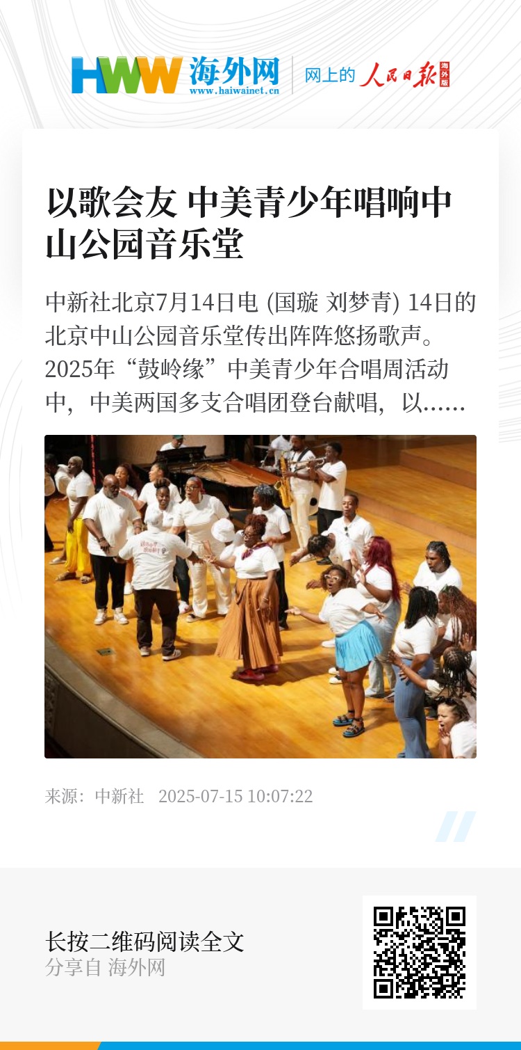 中新社北京7月14日电 (国璇 刘梦青) 14日的北京中山公园音乐堂传出阵阵悠扬歌声。2025年“鼓岭缘”中美青少年合唱周活动中,中美两国多支合唱团登台献唱,以音乐架起友谊的桥梁。