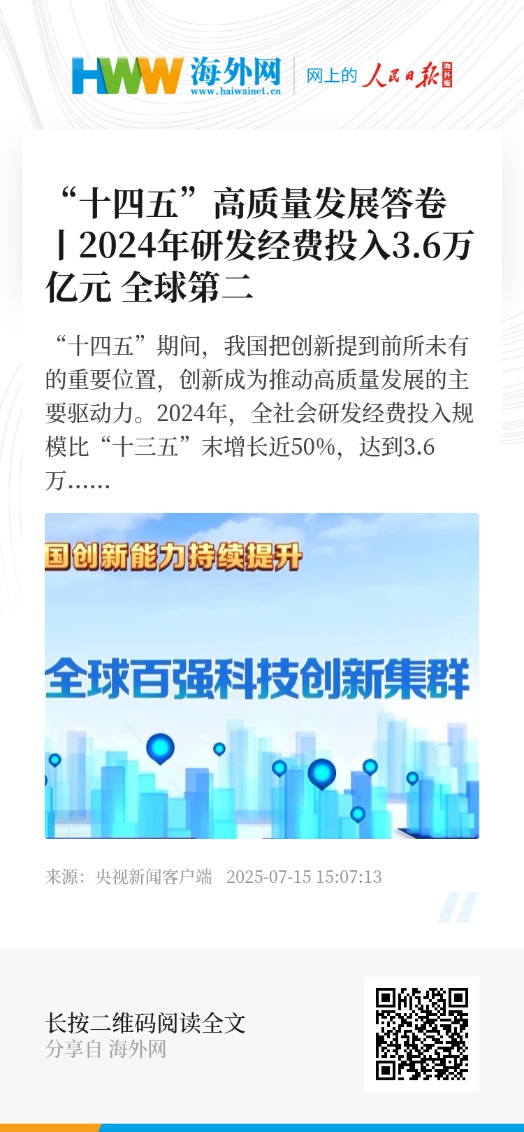 “十四五”期间,我国创新能力持续提升。全球规模最大的研发人员队伍,26个全球百强科技创新集群,46万多家高新技术企业,合力推动着科技创新和产业创新深度融合,2024年生产的集成电路产量比“十三五”末增加大约1900亿块,越来越多的产品装上了“中国芯”。2024年“三新”经济增加值超过24万亿元,相当于北京、上海、广东三个地区生产总值的总和。