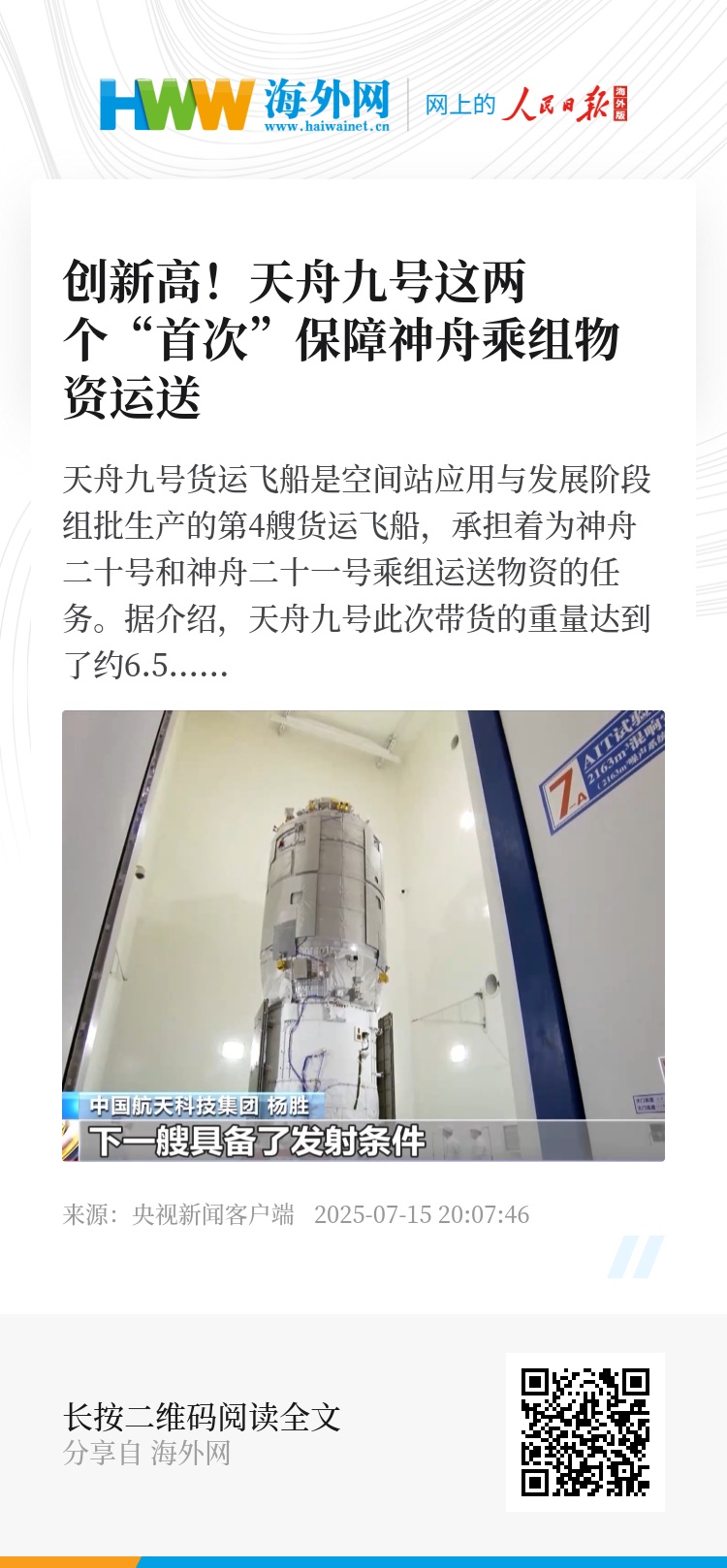天舟九号货运飞船是空间站应用与发展阶段组批生产的第4艘货运飞船,承担着为神舟二十号和神舟二十一号乘组运送物资的任务。据介绍,天舟九号此次带货的重量达到了约6.5吨,装载重量创新高。