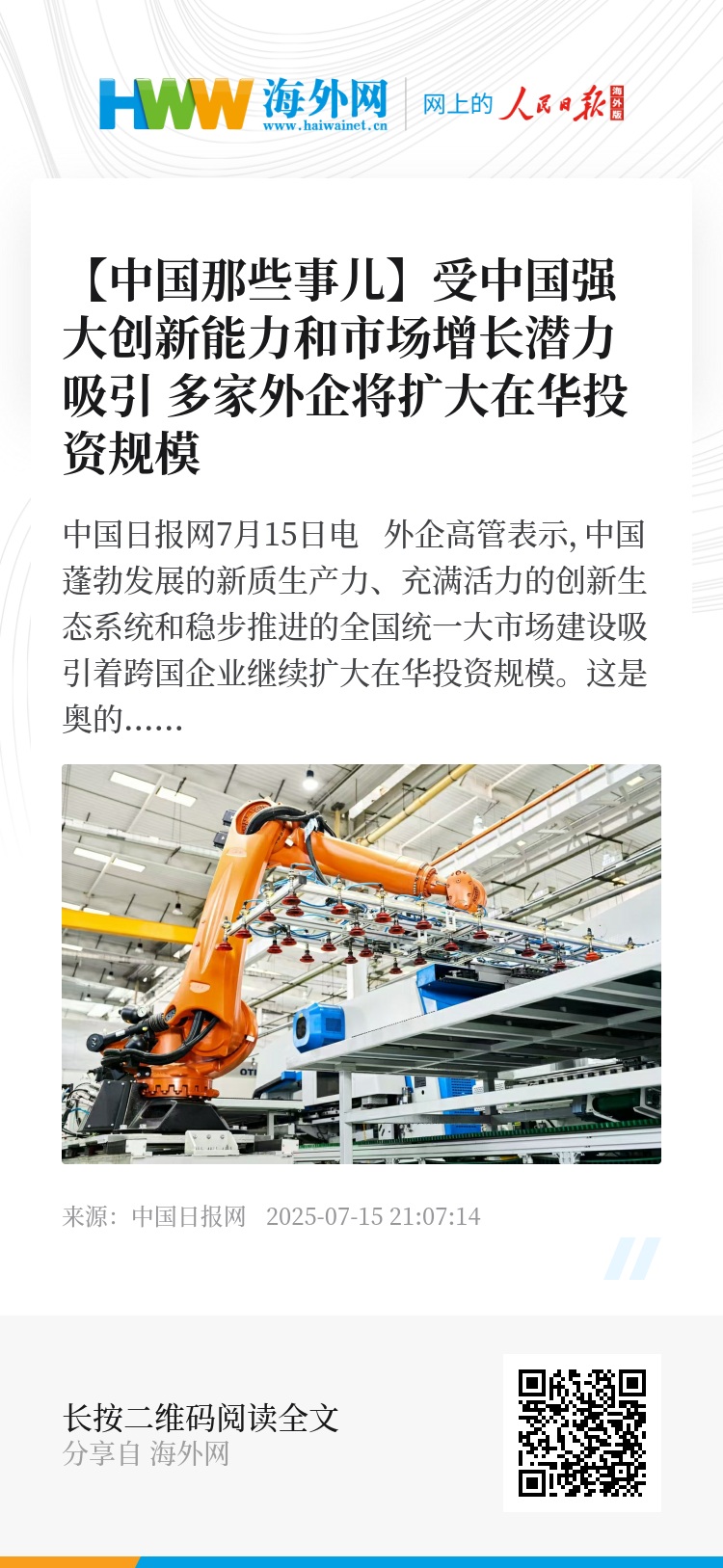 中国日报网7月15日电 外企高管表示,中国蓬勃发展的新质生产力、充满活力的创新生态系统和稳步推进的全国统一大市场建设吸引着跨国企业继续扩大在华投资规模。