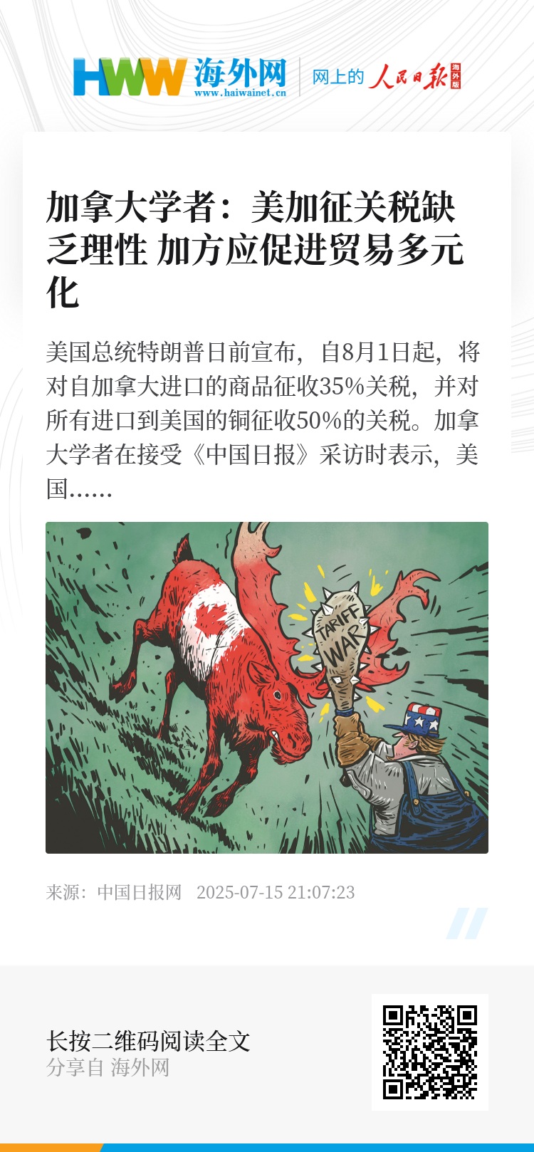 美国总统特朗普日前宣布,自8月1日起,将对自加拿大进口的商品征收35%关税,并对所有进口到美国的铜征收50%的关税。加拿大学者在接受《中国日报》采访时表示,美国此举或将导致加拿大失业率上升,并扰乱供应链。应对这种非理性的关税政策,加拿大应当寻求贸易多元化。