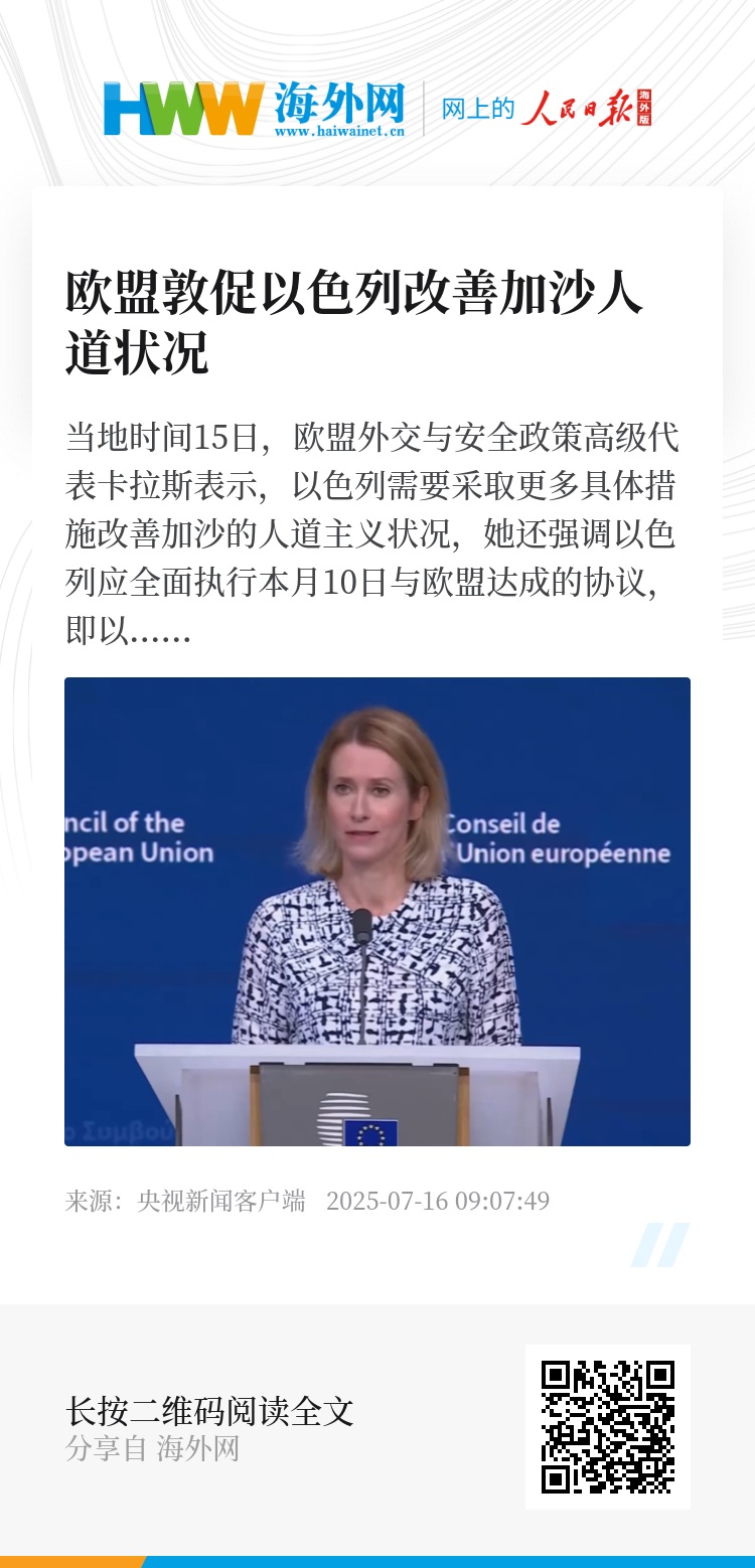 当地时间15日,欧盟外交与安全政策高级代表卡拉斯表示,以色列需要采取更多具体措施改善加沙的人道主义状况,她还强调以色列应全面执行本月10日与欧盟达成的协议,即以色列应开放更多过境点,允许更多载有援助物资的卡车进入加沙,修复加沙地带重要基础设施等。