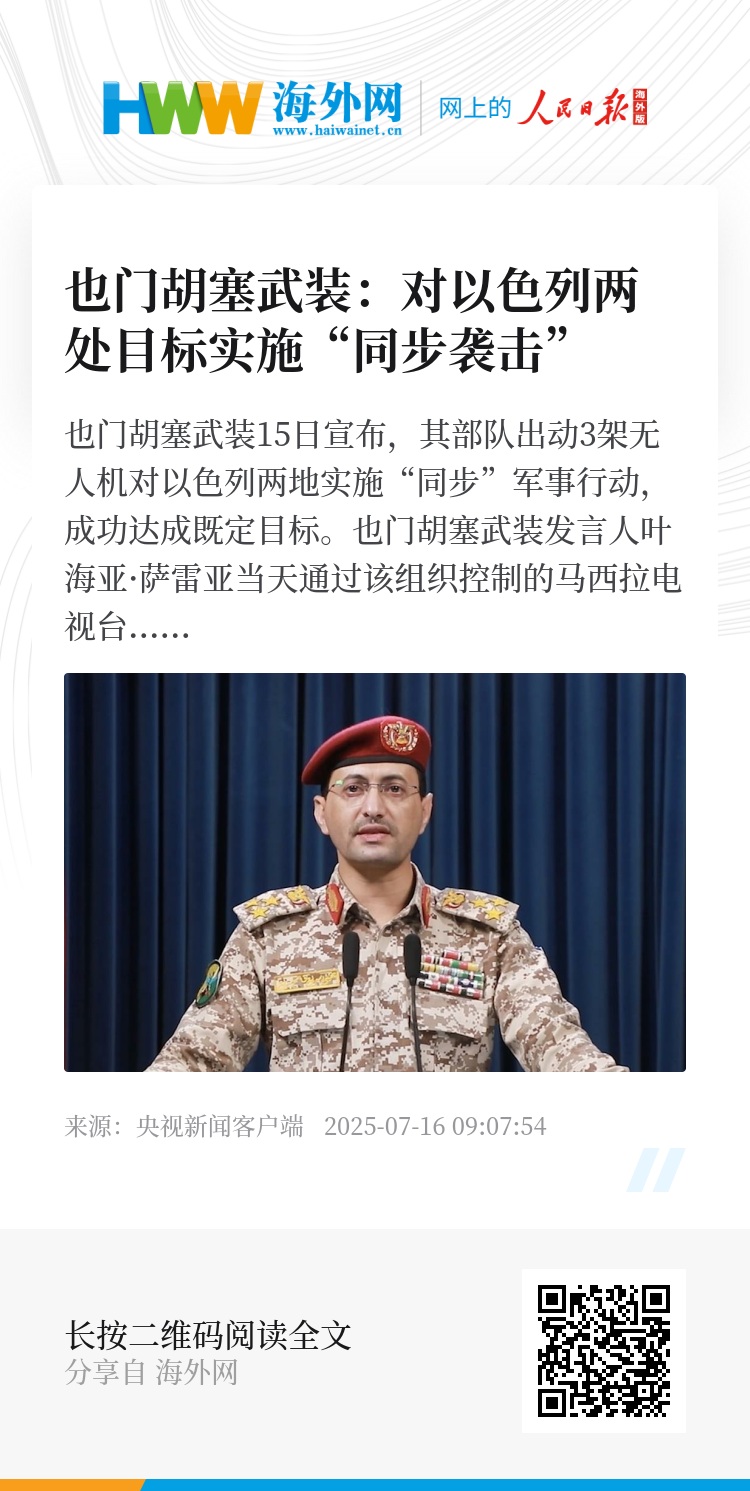 也门胡塞武装15日宣布,其部队出动3架无人机对以色列两地实施“同步”军事行动,成功达成既定目标。