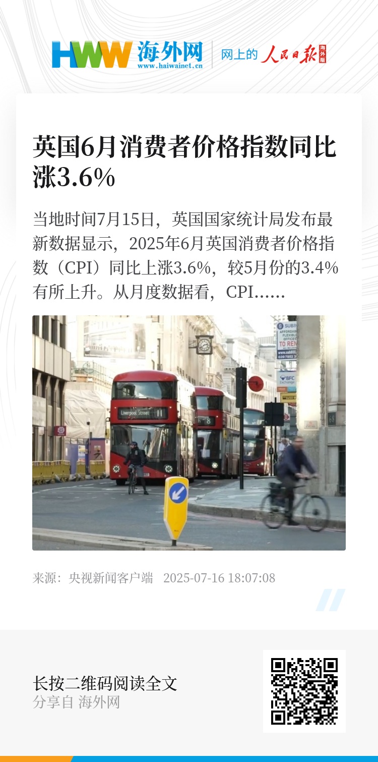 当地时间7月15日,英国国家统计局发布最新数据显示,2025年6月英国消费者价格指数(CPI)同比上涨3.6%,较5月份的3.4%有所上升。