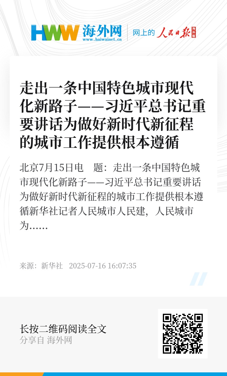 新华社北京7月15日电 题:走出一条中国特色城市现代化新路子——习近平总书记重要讲话为做好新时代新征程的城市工作提供根本遵循