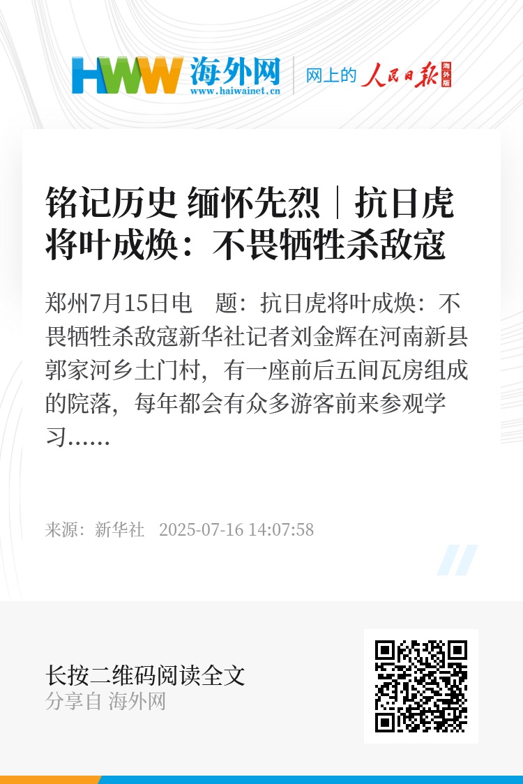 新华社郑州7月15日电 题:抗日虎将叶成焕:不畏牺牲杀敌寇