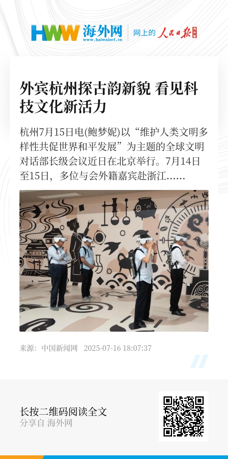 拥有科技创新优势的杭州,正借科技力量赋能当地的文化遗产保护、传承、利用。杭州良渚古城遗址是实证中华五千多年文明史的圣地。在良渚古城遗址公园,外籍嘉宾头戴VR眼镜,沉浸式体验了良渚时期的祭祀与抗洪场景。