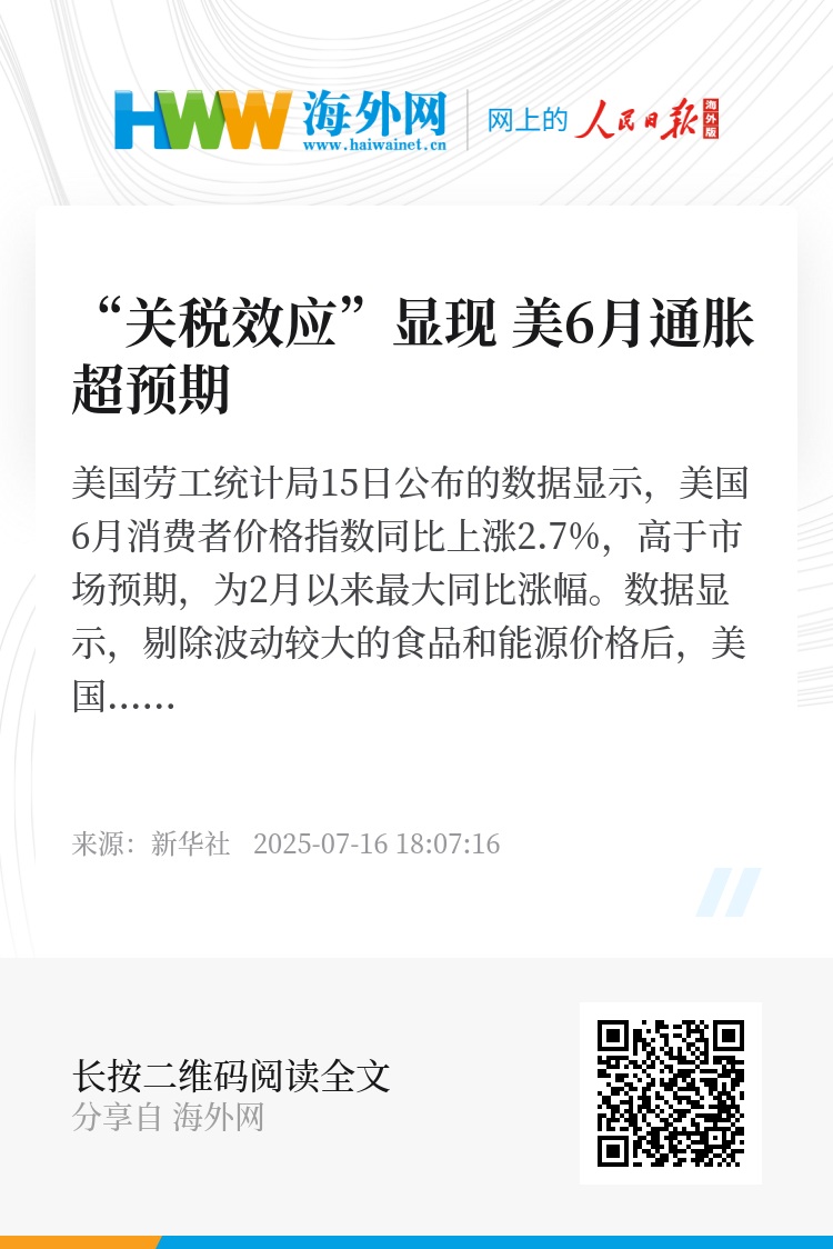 美国劳工统计局15日公布的数据显示,美国6月消费者价格指数同比上涨2.7%,高于市场预期,为2月以来最大同比涨幅。