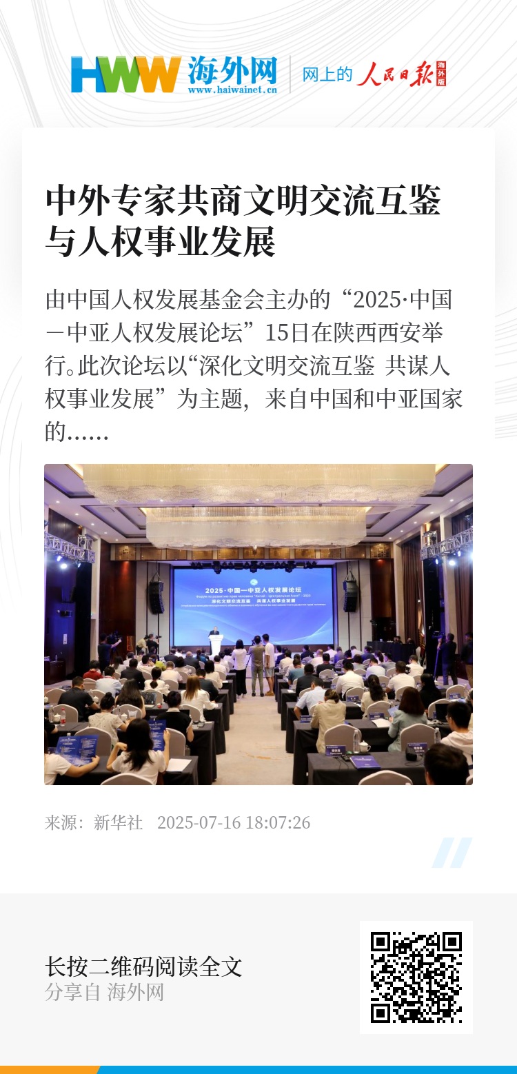 由中国人权发展基金会主办的“2025·中国-中亚人权发展论坛”15日在陕西西安举行。此次论坛以“深化文明交流互鉴 共谋人权事业发展”为主题,来自中国和中亚国家的有关部门官员、专家学者、媒体记者和人权机构、社会组织负责人等60余名嘉宾与会。
