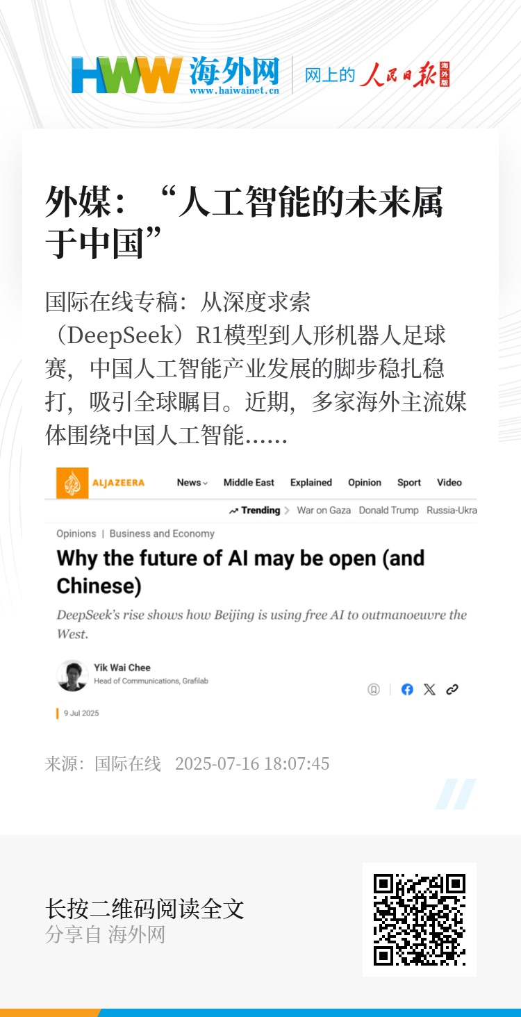 卡塔尔半岛电视台报道表示,人工智能的未来是开源的,而且是属于中国的。中国强大的开源人工智能模型DeepSeek-R1模型的发布,给全球科技行业带来巨大震动,挑战了美国在人工智能领域的主导地位,打破了硅谷封闭的商业模式,更改变了全球人工智能地缘格局。这种开源模式已成为中国提供的战略性解决方案,具有高度灵活、全球协作、成本较低的优势。中国的人工智能产业还具备速度与规模优势,中国企业通过大量投放具有成本优势和优越性能的模型提高竞争力。未来人工智能主导权或将属于那些能够实现普遍可触达性和持续创新的玩家,而中国在美国技术封锁下坚持自主发展芯片产业,并凭借开放且去中心化的研发模式重塑全球人工智能格局。