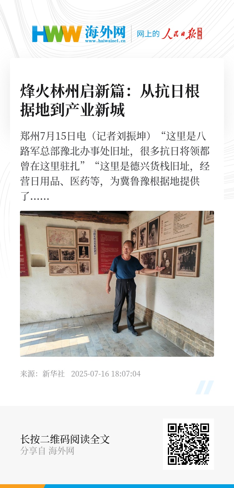 新华社郑州7月15日电(记者刘振坤)“这里是八路军总部豫北办事处旧址,很多抗日将领都曾在这里驻扎”“这里是德兴货栈旧址,经营日用品、医药等,为冀鲁豫根据地提供了充足物资”“这里是八路军抗日完全小学旧址……这里是林北县抗日民主政府旧址……”