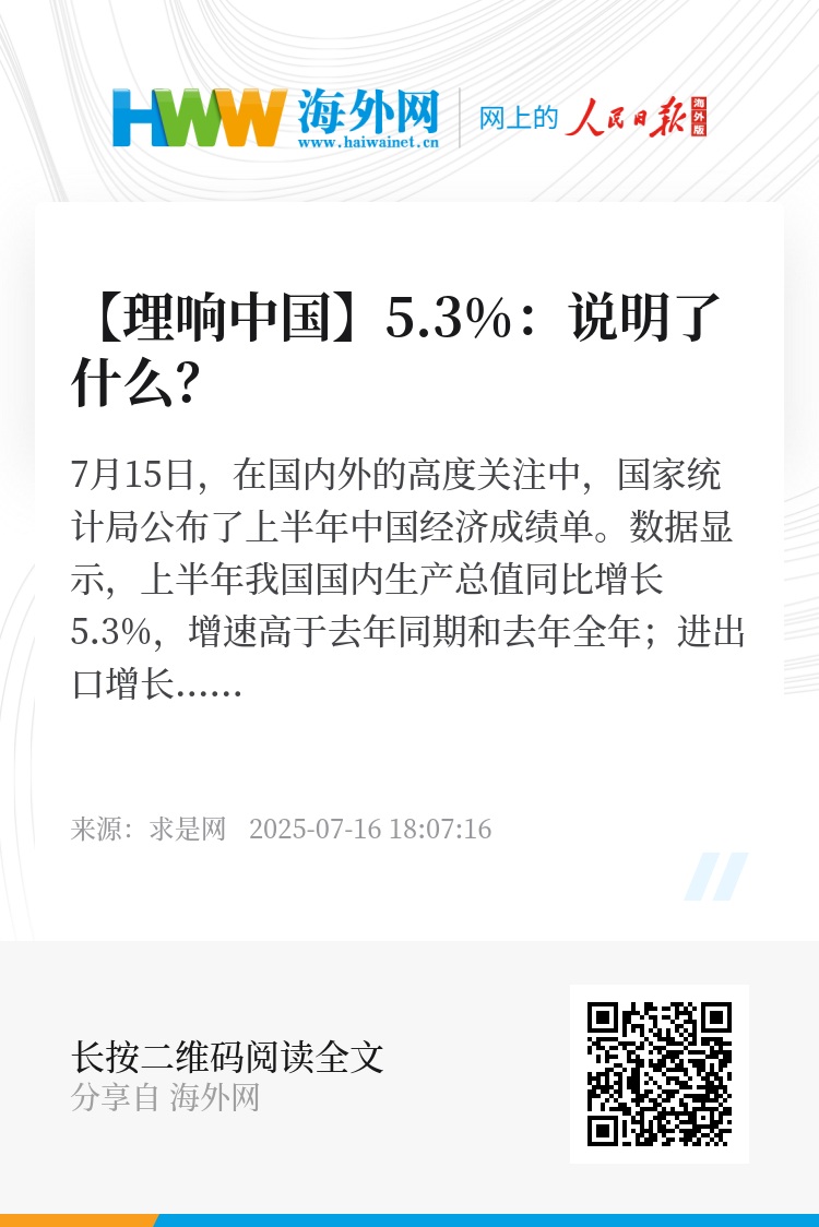 7月15日,在国内外的高度关注中,国家统计局公布了上半年中国经济成绩单。数据显示,上半年我国国内生产总值同比增长5.3%,增速高于去年同期和去年全年;进出口增长2.9%,其中出口增长7.2%。这表明,中国经济顶住了下行压力,保持了稳中有进、稳中向好的发展态势。