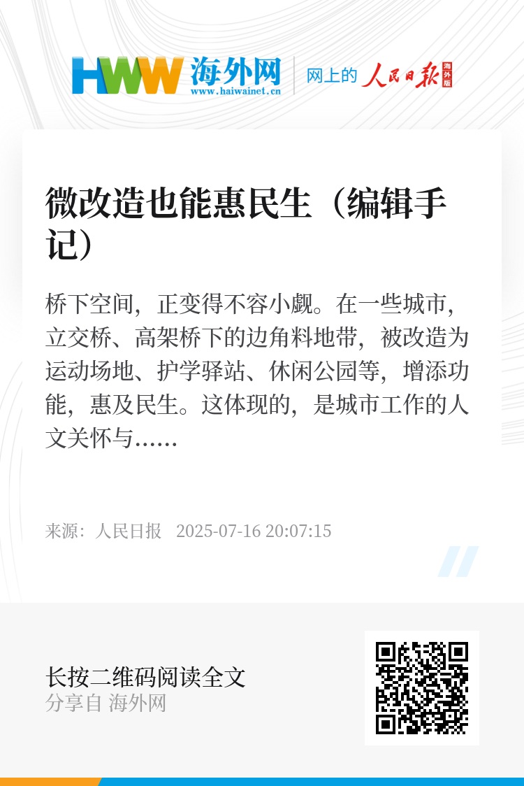 桥下空间,正变得不容小觑。在一些城市,立交桥、高架桥下的边角料地带,被改造为运动场地、护学驿站、休闲公园等,增添功能,惠及民生。这体现的,是城市工作的人文关怀与公共服务的细腻笔触。