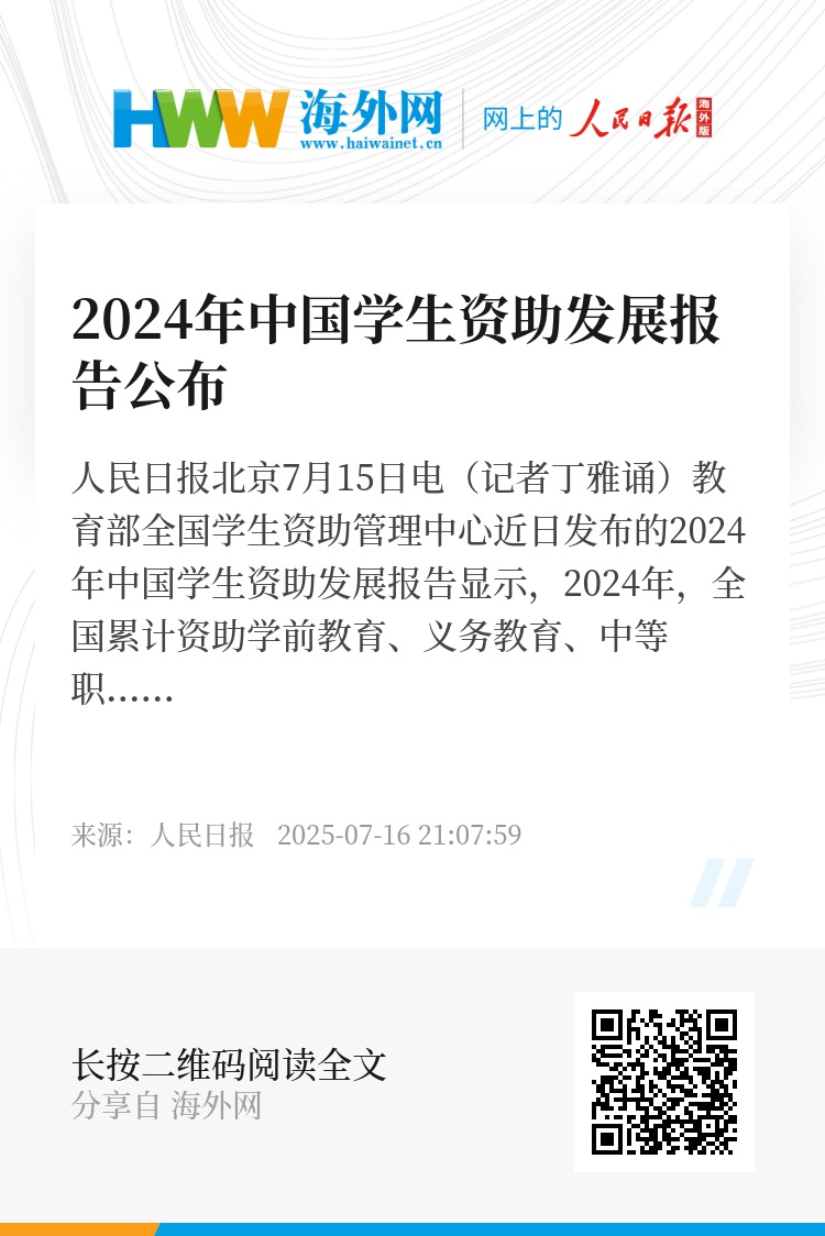人民日报北京7月15日电(记者丁雅诵)教育部全国学生资助管理中心近日发布的2024年中国学生资助发展报告显示,2024年,全国累计资助学前教育、义务教育、中等职业教育(包括人力资源和社会保障部门管理的技工院校)、普通高中教育和普通高等教育学生15077.11万人次(不包括义务教育免除学杂费和免费教科书),累计资助金额3412.11亿元。其中,资助学前教育幼儿625.40万人次,资助金额86.70亿元;资助义务教育学生6781.00万人次,资助金额585.65亿元;资助中等职业教育学生1879.54万人次,资助金额391.24亿元;资助普通高中教育学生1295.56万人次,资助金额172.11亿元;资助普通高等教育学生4495.61万人次,资助金额2176.42亿元。