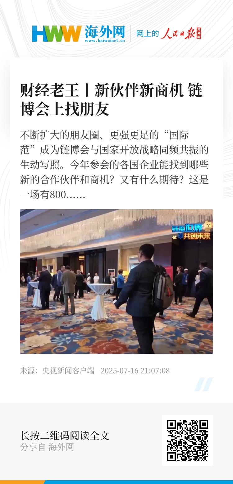 宴会结束,老王发现,这次来参加链博会的企业家们,无论是第一次来的新朋友,还是第三次参加的全勤生,无论是要寻找同一产业链上的伙伴,还是要做跨“链”对接,都对链博会充满期待。在老王看来,这些期待不单单来自越办越好的链博会本身,更是出于对中国供应链韧性的信任,对中国日益开放的市场的信心。世界各国的朋友汇聚链博会,正是在用实际行动,携手“链”接世界,共创未来。