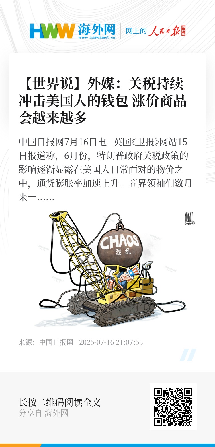 中国日报网7月16日电 英国《卫报》网站15日报道称,6月份,特朗普政府关税政策的影响逐渐显露在美国人日常面对的物价之中,通货膨胀率加速上升。商界领袖们数月来一直警告称,高昂且波动的关税税率将迫使企业提高消费品价格。