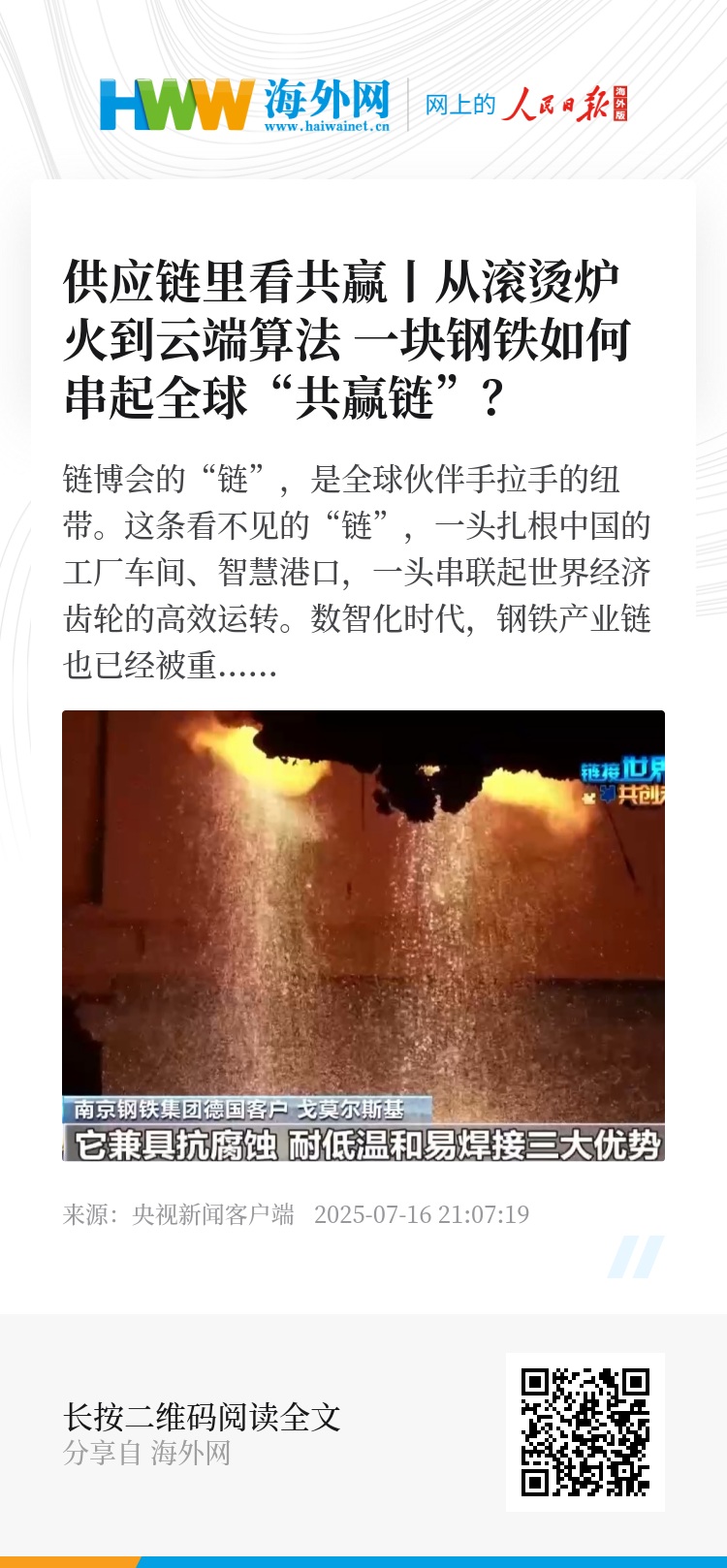 当一块钢铁“注入”共赢的温度,中国先进制造的价值,正在用“链”和技术串联起全球的资源与需求。依托强大的产业链供应链,我国制造业规模连续15年全球第一,200多种主要工业品产量世界第一,不断把“供应链”化为“共赢链”。这就是新质生产力时代的共赢之道。