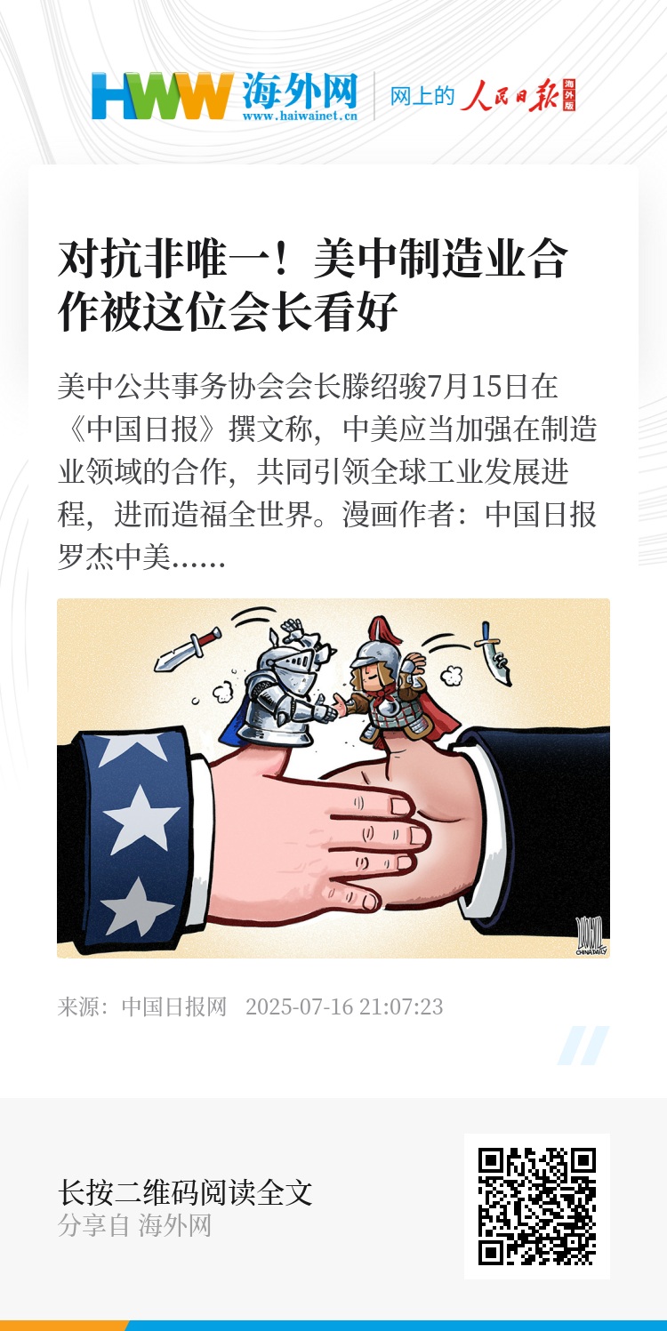 美中公共事务协会会长滕绍骏7月15日在《中国日报》撰文称,中美应当加强在制造业领域的合作,共同引领全球工业发展进程,进而造福全世界。
