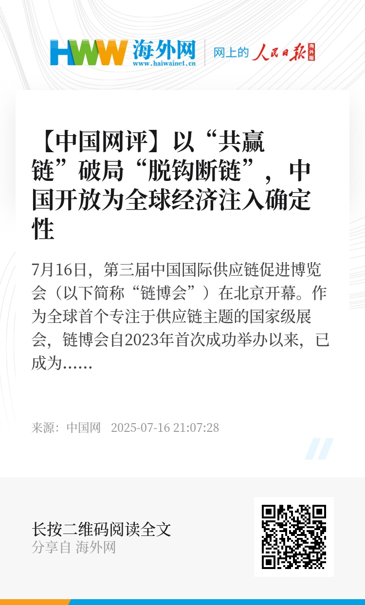 当前,全球经济复苏乏力,地缘政治冲突加剧,维护供应链稳定比以往任何时候都更为紧迫。连续举办三届的链博会让世界看到了中国推进高水平对外开放的信心和决心。链博会的“链”不是“脱钩断链”的零和博弈,而是各国企业共享机遇、共谋发展的“共赢链”。中国通过这一平台向世界宣告:只有坚持开放合作,才能实现全球经济的可持续增长。未来,中国将继续以链博会为纽带,与各国携手强化供应链韧性,为世界经济注入更多确定性。(中国网评论员 乐水)