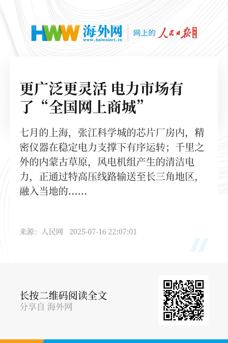 七月的上海,张江科学城的芯片厂房内,精密仪器在稳定电力支撑下有序运转;千里之外的内蒙古草原,风电机组产生的清洁电力,正通过特高压线路输送至长三角地区,融入当地的用电网络。这一日常的能源输送场景,体现着我国电力市场资源优化配置能力的逐步提升。