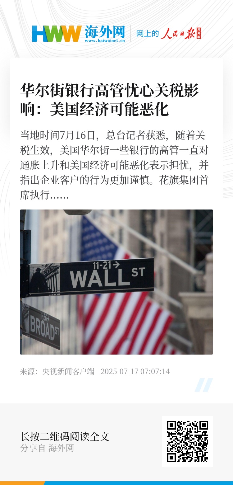 当地时间7月16日,总台记者获悉,随着关税生效,美国华尔街一些银行的高管一直对通胀上升和美国经济可能恶化表示担忧,并指出企业客户的行为更加谨慎。