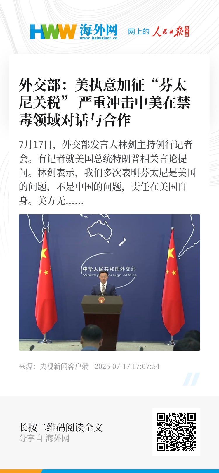 7月17日,外交部发言人林剑主持例行记者会。有记者就美国总统特朗普相关言论提问。