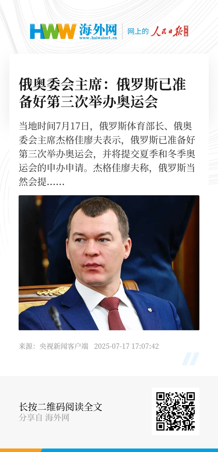 当地时间7月17日,俄罗斯体育部长、俄奥委会主席杰格佳廖夫表示,俄罗斯已准备好第三次举办奥运会,并将提交夏季和冬季奥运会的申办申请。