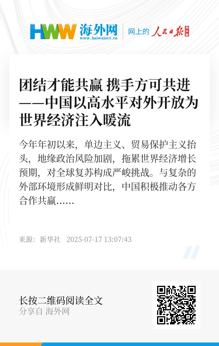 中国国家主席习近平今年5月向第二十届中国西部国际博览会致贺信时指出,团结才能共赢,携手方可共进。中国坚持高水平对外开放,以实际行动为世界经济注入一股暖流。