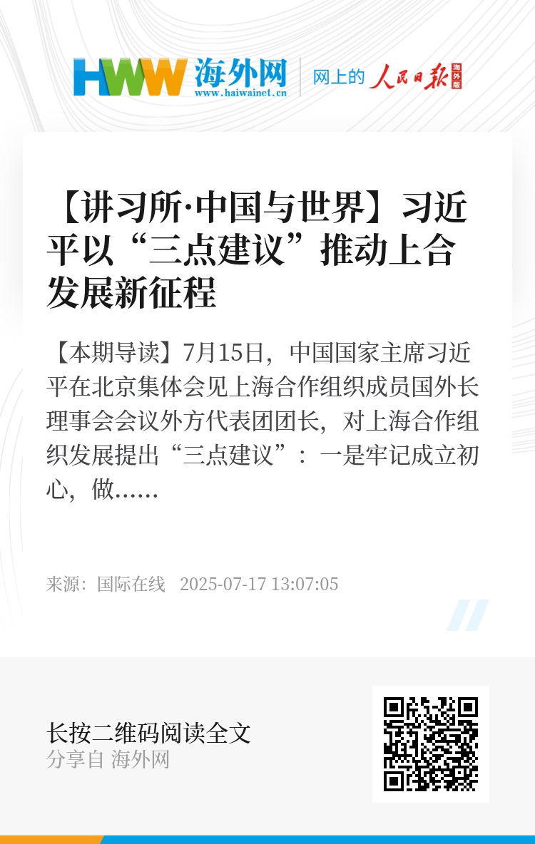 “让‘上海精神’持续照亮构建上海合作组织命运共同体之路。”上海合作组织成立24年来,始终秉持“上海精神”,成功走出了一条顺应时代潮流、契合各方需求的区域合作道路,树立起新型国际关系的典范。在国际人士眼中,上海合作组织站在历史正确一边,致力于建设一个更加平等,更加包容,更加公平公正的世界,对维护地区和全球和平至关重要。