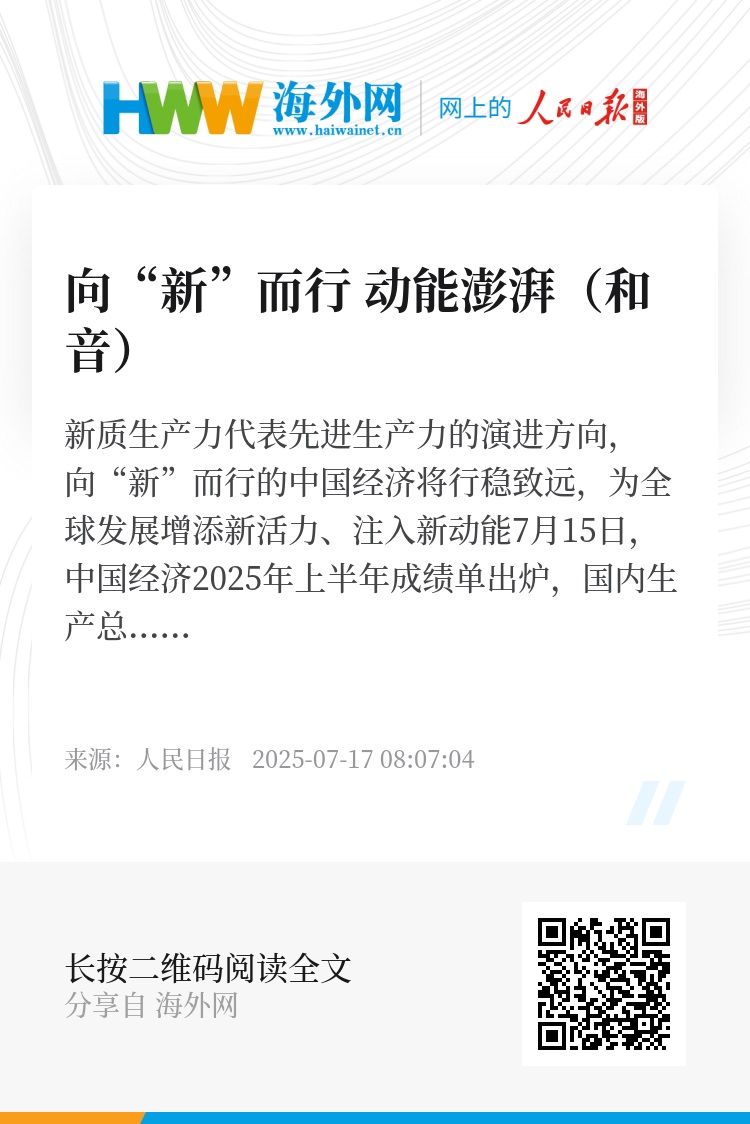 与中国同行就是与机遇同行。新质生产力代表先进生产力的演进方向,向“新”而行的中国经济将行稳致远,为全球发展增添新活力、注入新动能。