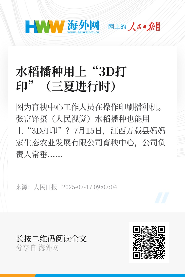 江西省农业科学院农业工程研究所研究员吴罗发介绍,“3D打印”水稻播种,将稻种精准排列并粘在食用原料制成的可降解育秧纸上,可实现精量化、机械化育秧,降低种植成本,提升水稻产量。