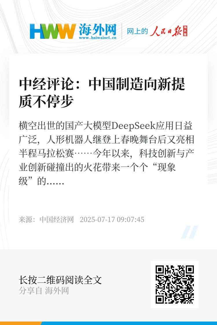 实业兴国,实干兴邦。锚定高质量发展不动摇,以高水平科技自立自强“强筋壮骨”,将创新势能加快转化为产业动能,中国制造向新而行,永不停步。(中国经济网评论员 邓浩)