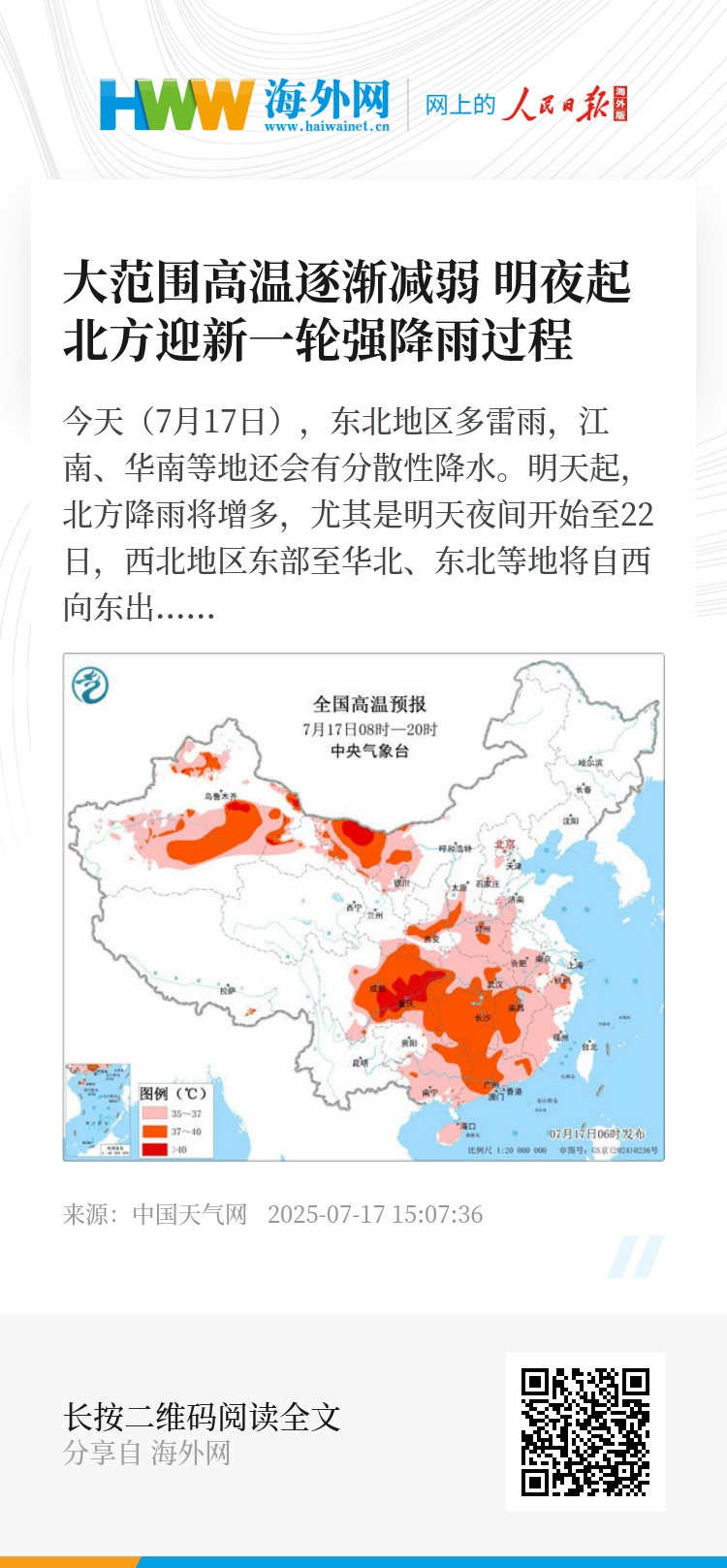 今天(7月17日),东北地区多雷雨,江南、华南等地还会有分散性降水。明天起,北方降雨将增多,尤其是明天夜间开始至22日,西北地区东部至华北、东北等地将自西向东出现一次强降雨过程。在冷空气和降雨的打压下,大范围高温也将逐渐消减。今明天,40℃以上的区域将收缩,主要集中在四川盆地一带。