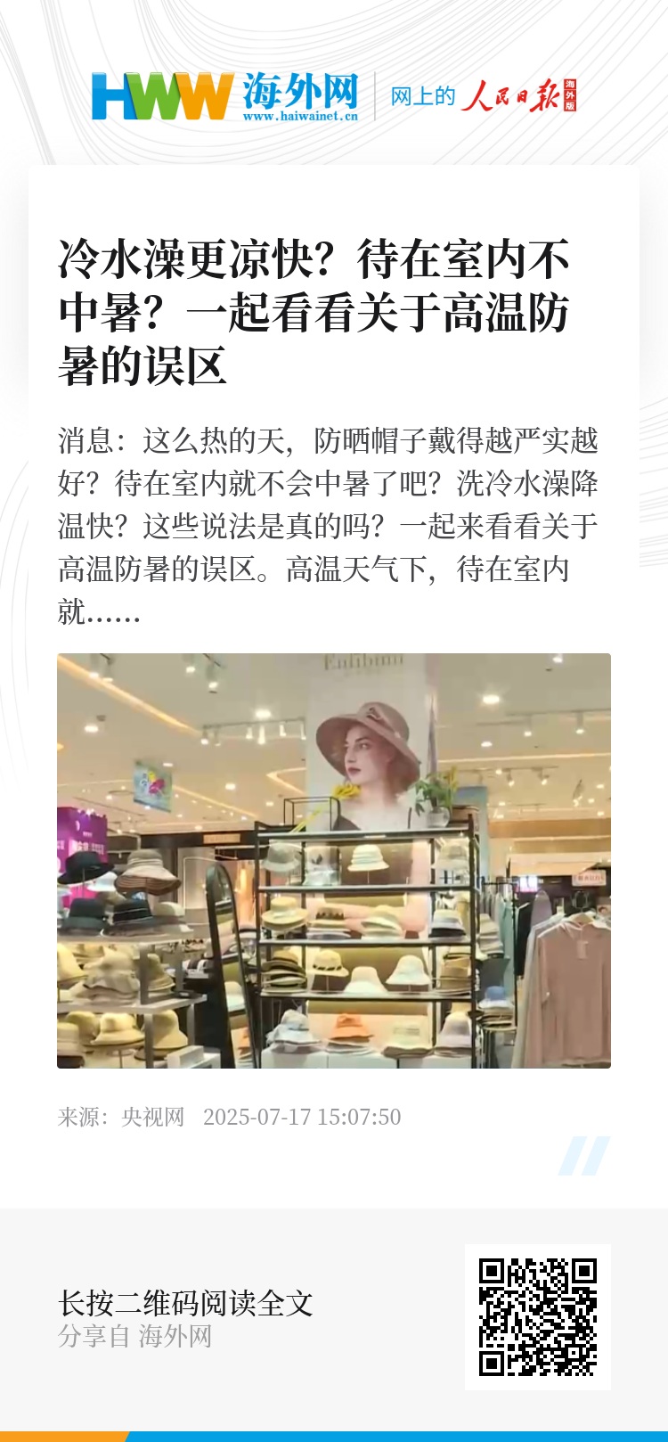 央视网消息:这么热的天,防晒帽子戴得越严实越好?待在室内就不会中暑了吧?洗冷水澡降温快?这些说法是真的吗?一起来看看关于高温防暑的误区。