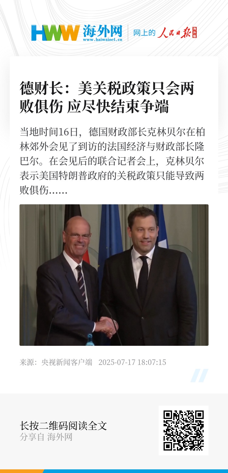 当地时间16日,德国财政部长克林贝尔在柏林郊外会见了到访的法国经济与财政部长隆巴尔。在会见后的联合记者会上,克林贝尔表示美国特朗普政府的关税政策只能导致两败俱伤,美国不应继续采取挑衅或威胁的行动,而应与欧盟进行认真谈判,尽快结束关税争端。